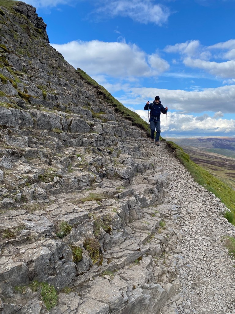 On the day in question, we got up early and were on the road just after 6am and heading out from the carpark in Horton-in-Ribblesdale at about 7:30. Our rucksacks were loaded with food, warm clothing, spare socks and even special plasters for blisters. Following Rick‘s advice we set off up Ingleborough first – easier to go up the worst bit when we were fresh, than come down after a hard day. It started quite gently and for the next 2 hours it got gradually steeper until we went up some nice carved steps over a few rocks to the summit. We were feeling fit and making good time. I was surprised at how easy it was and wondered if Rick had been worrying too much about our ability in the mountains. I looked at our average speed on my Apple watch and thought it was excellent, and now we had an easy downhill bit we‘d make up more time.