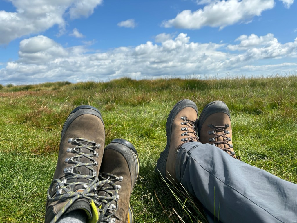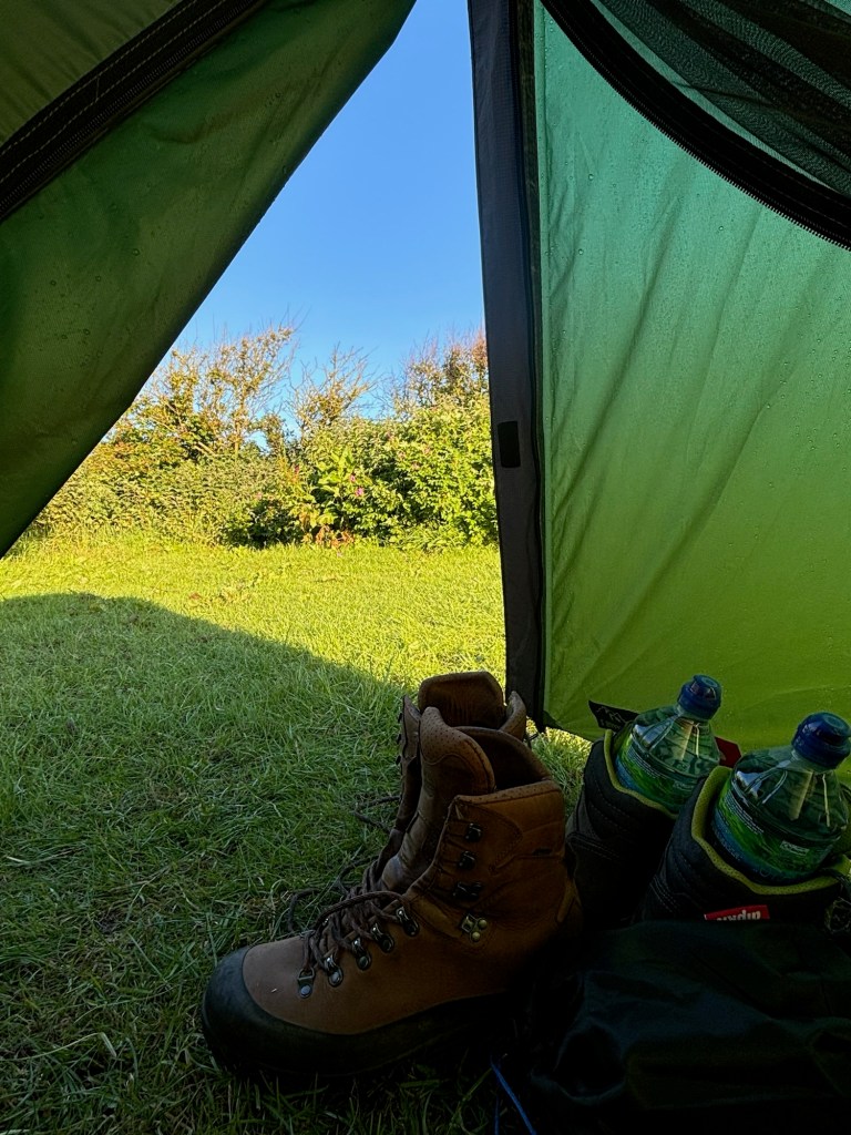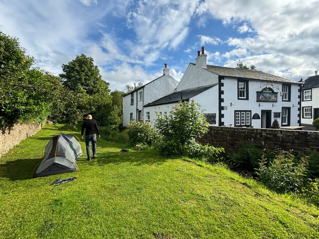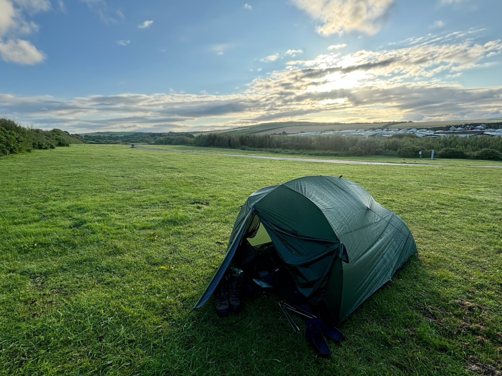 Rob took a photo of us stood next to the sign signifying the start of the walk, and then left us to start our adventure. We checked in at the campsite which was mainly static caravans and plodded to the camping field. We were the only occupants. We set our gear up reasonably quickly, zipped up the tent and wandered around St Bees. We had some lunch in the café on the front, which had a strange 1950s vibe, wandered around the village of St Bees and took a small walk up the coast. Some time in the afternoon it started raining and didn‘t stop. I found St Bees village to be a little depressing, as I do lots of English seaside resorts that have probably seen better days. We didn‘t care. Later on we set up our new cooking stove and boiled water for a dinner of Pot Noodles in the dry laundry room. I hadn‘t had Pot Noodles for decades and can still remember the hype when they came out in the 1980s. I had imagined that the food technicians would have improved them over the intervening decades. Turns out I was wrong – they tasted terrible, the peak of ultra-processed rubbish and they gave me quite spectacular wind. Not the best side-effect when you are embarking on a fortnight sharing a tiny tent with your wife. I hoped the wind and rain on the tent might somehow disguise things. I also had a vague feeling of constipation which would stay with me for a few days.