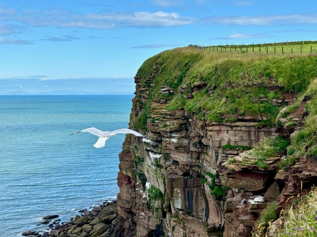 But now all the worries were behind us and we enjoyed the views of the sea cliffs, teeming with birds and could even see the Isle of Man out in the distance. We made quick time to the first real landmark, the lighthouse and St Bees head, and rewarded ourselves with a breakfast of porridge cooked on our „Brukit“ gas stove. I also took the opportunity to dry out our tent which was still damp as we had packed it away hurriedly that morning. We felt good. We had used some water, eaten some food and dried the tent. Our packs were a little lighter so we could head up to Whitehaven for those sleeping bags.