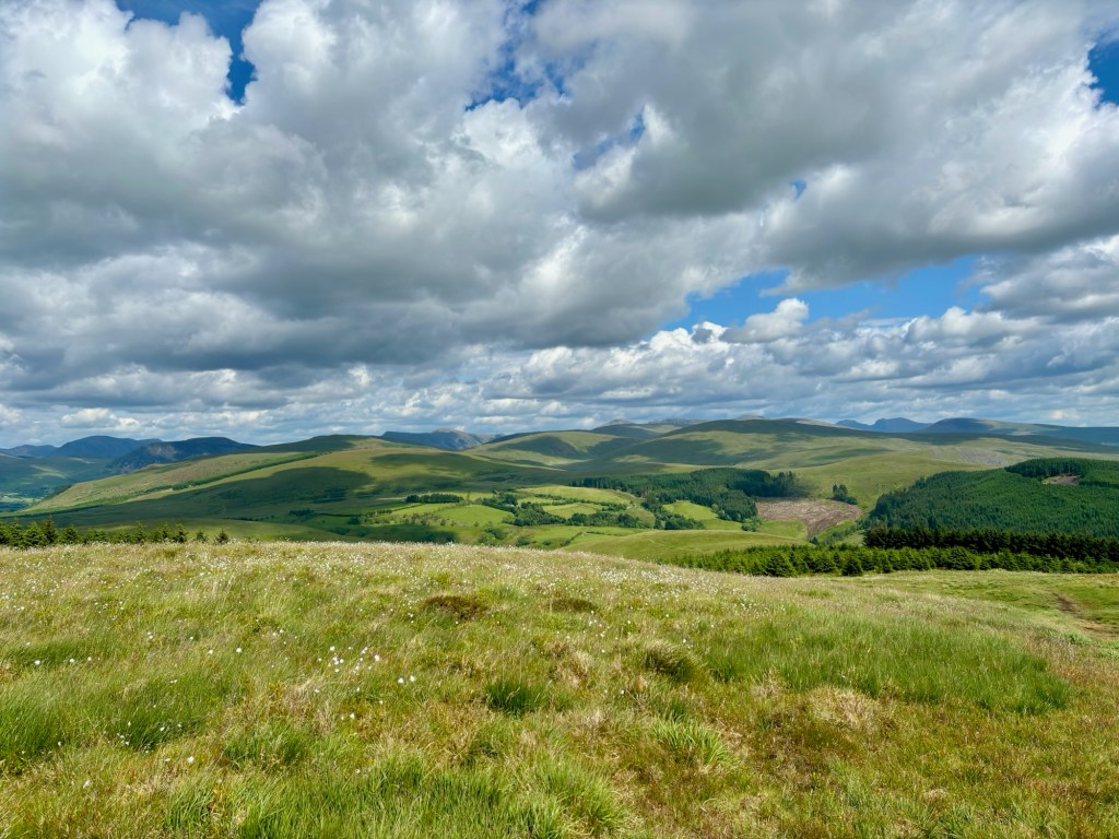 We had done a loop up and down the coastline but now we were heading straight inland and could see the hills of the Lake District which we‘d be crossing in the next days. An hour later we had left roads, towns and villages and were following a wooded track up Dent Fell, the first climb of the walk. It was perfect walking weather. Sunny, but cool. We crossed a little footbridge over a clear mountain stream and the path started to steepen. After a little while we passed through what looked like a recently abandoned farmyard, and were plunged into a different world for a minute or so. One minute we were on a shady path, and then suddenly we popped out of the woods and the trail skirted around this farm. We walked past a skip which was overflowing with burnt tin cans. There were rusty bikes, a few cars and tractors stood around rotting in the weeds. It was the perfect setting for the climax to a horror film. The uneasy feeling was short-lived, however, and we were soon through the next gate and heading through the forest to Dent Fell. After a few minutes, we were through the trees and onto open moorland on the top of the hill. The views were magnificent so we had a drink, a short rest and took some photos. It was early afternoon and more or less all downhill to our first stop.