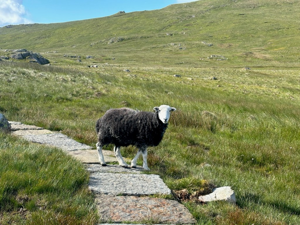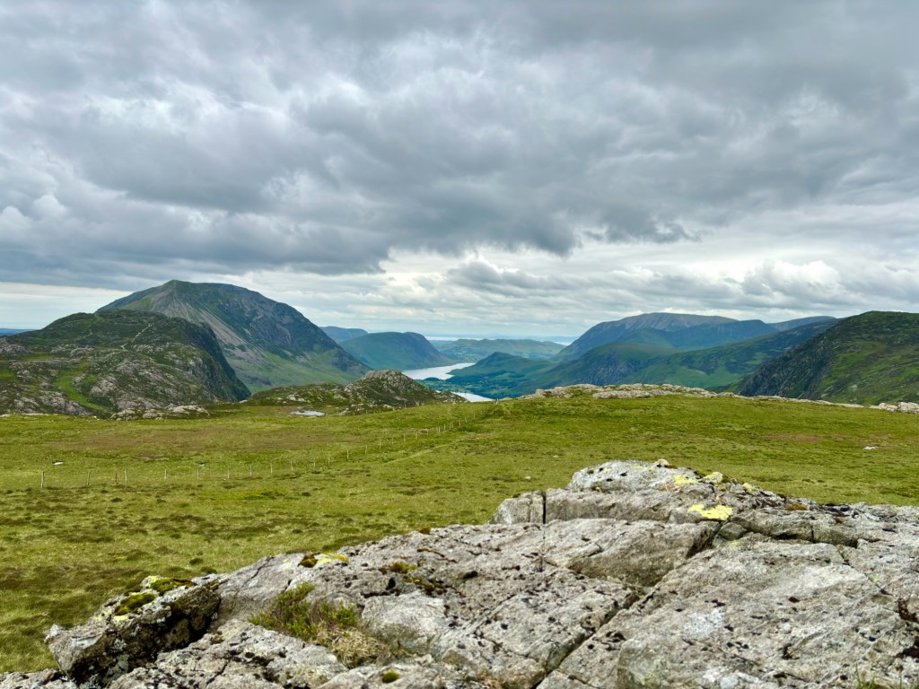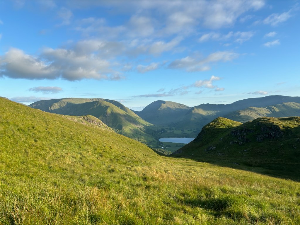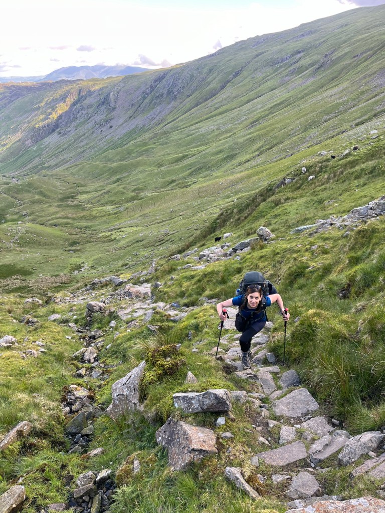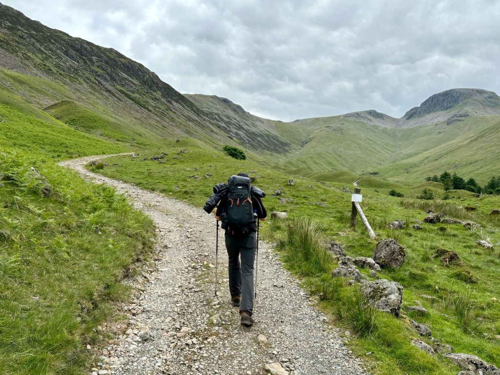 We woke up to cloudy skies but no rain. The pub opened their doors at 7am so we could get washed and fill our water bottles, and we also took the chance to have a quick bacon roll and a cup of coffee, before setting off on our first proper day in the Lake District. The first half of the walk would be quite straightforward and flat, followed by a big climb over to Honister pass before dropping into the pretty valley of Borrowdale.