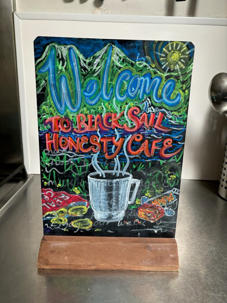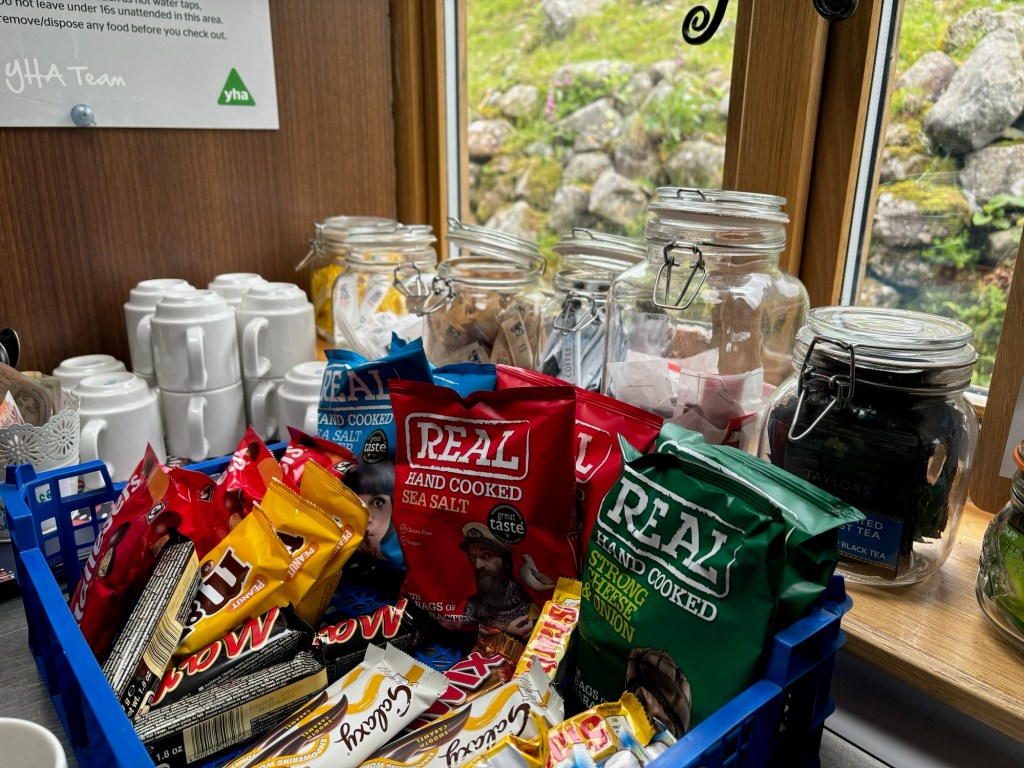 Time passes more quickly than you realise on these walks, and as we started up the gentle climb to the Black Sail youth hostel, we began to feel a bit hungry. Ariane definitely wanted to eat something before tackling the steep climb over to Honister. We didn‘t have much with us as I knew there was a café later on, but I needn‘t have worried because at Black Sail there was an „Honesty Café“. We were to encounter these at several locations over the next few days. In the hostel we found snacks, some fruit as well as hot and cold drinks. There is a price list and you just leave cash in the box for what you take. We both had a strong cup of tea and a couple of chocolate bars. The group were all gathered there too and set off up the hill as we arrived.