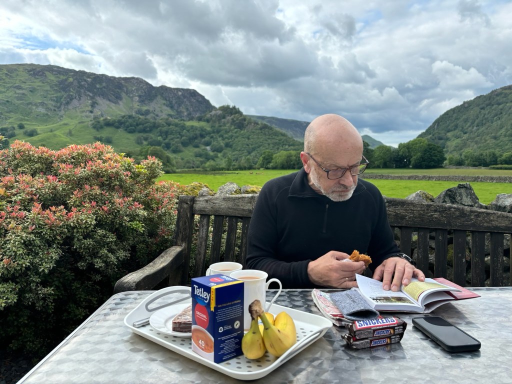 We were soon heading downhill into Borrowdale and the village of Rosthwaite. Here our good luck continued as we found a little tea room which was going to close in 5 minutes. We were tired out and our feet were really hurting, so we ordered tea, cake and flapjacks before sitting out in the sun to watch a robin and some sparrows pick the crumbs. We also took off our boots and socks and gave our feet some much needed fresh air.