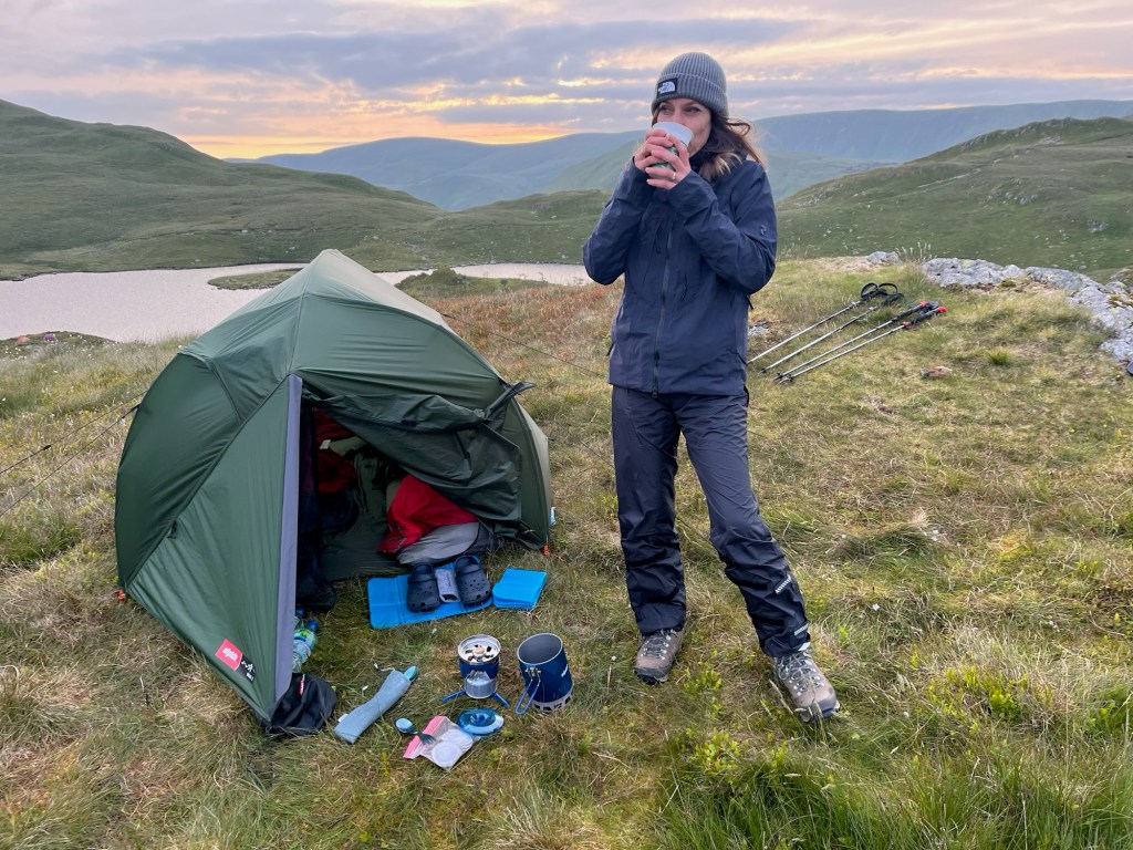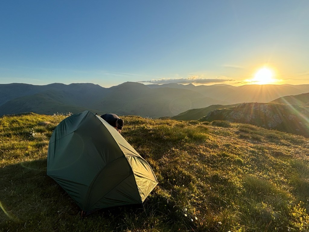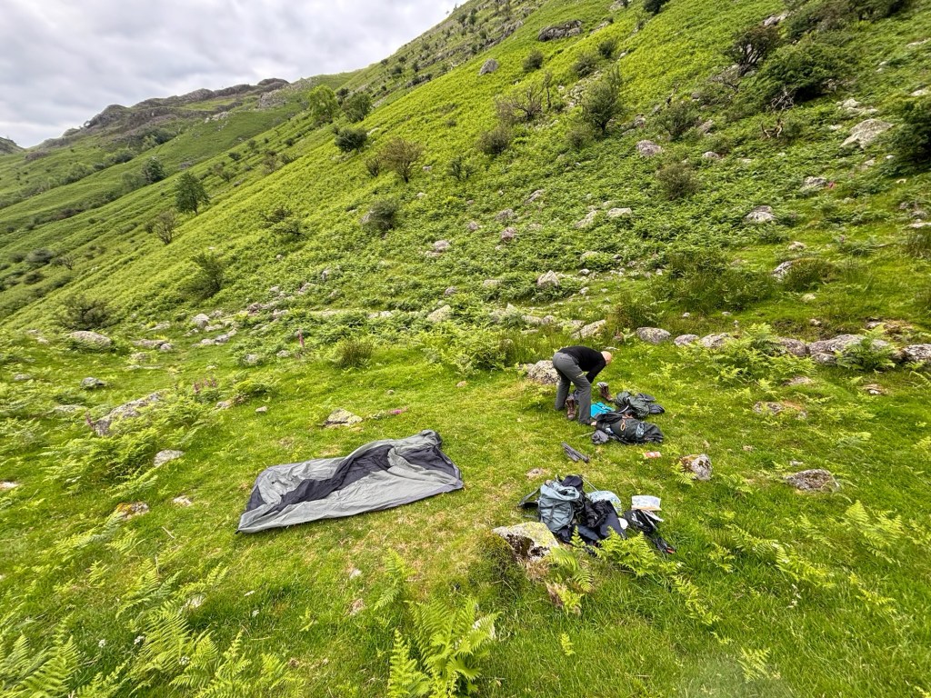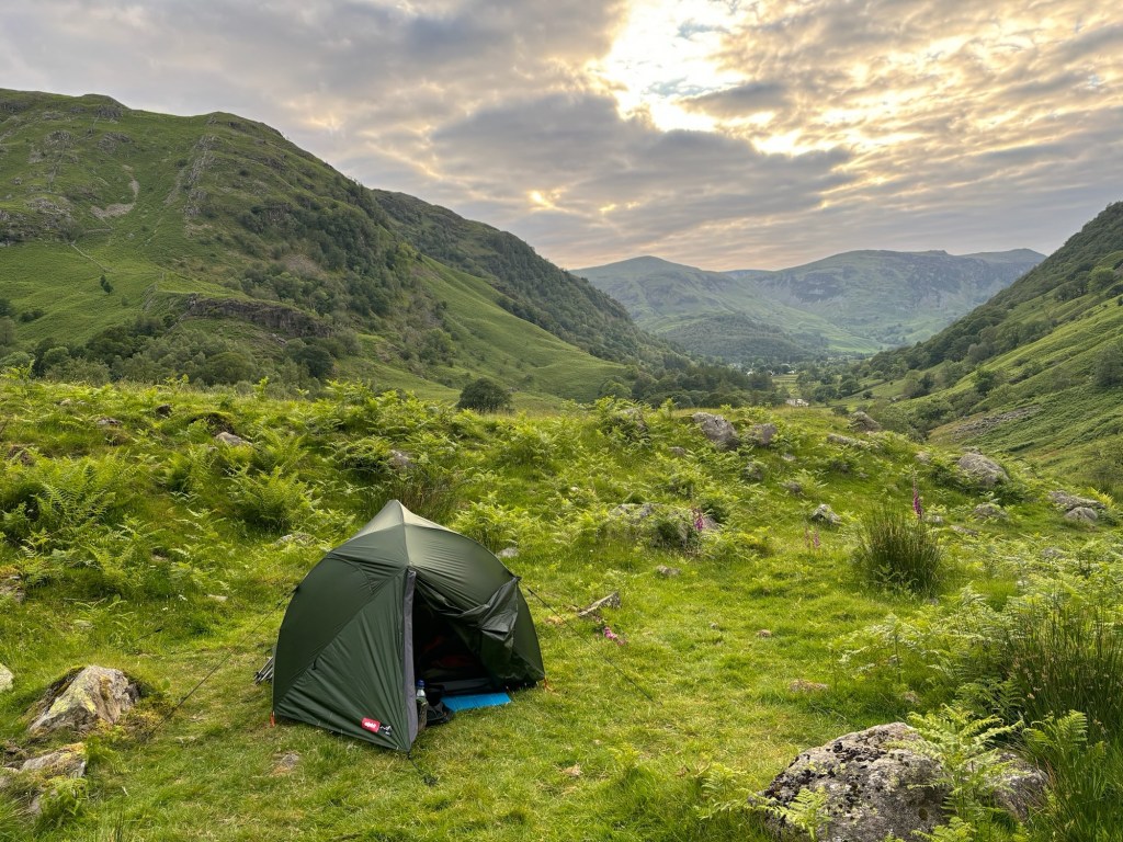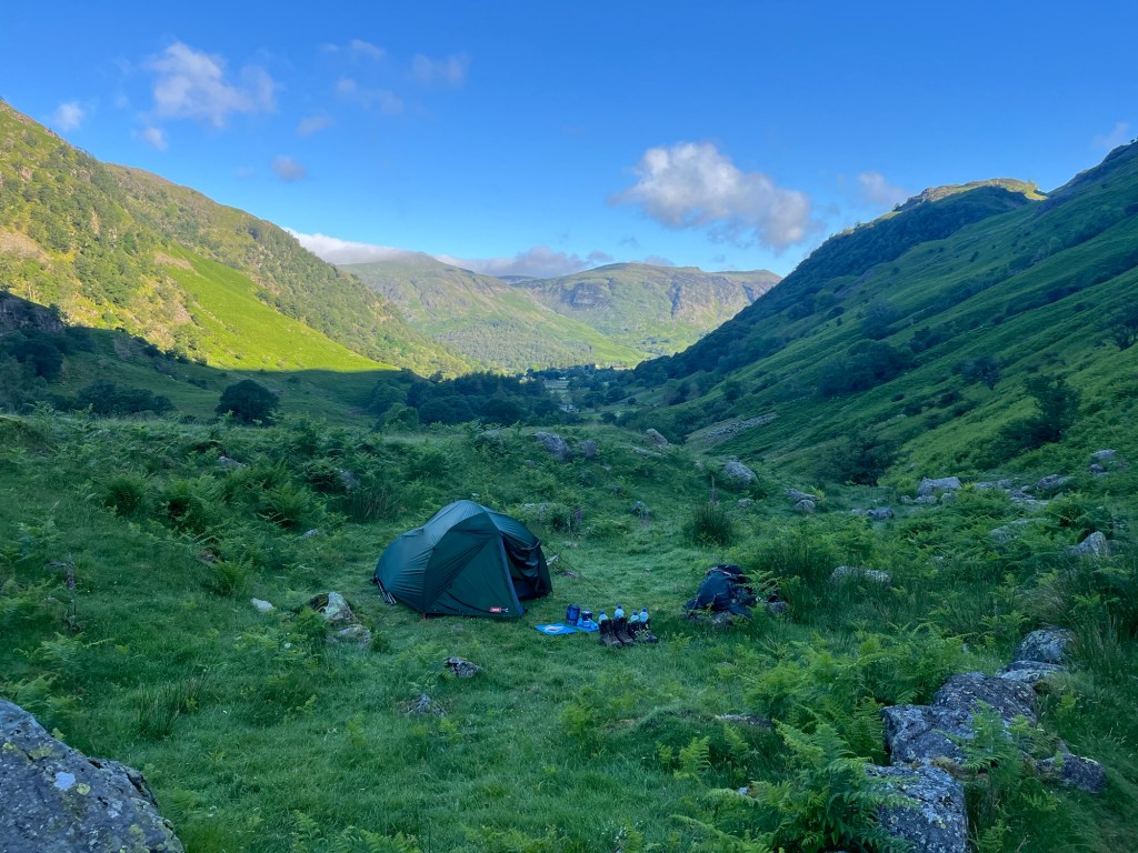 Our plan was to walk on a little and find a spot to „wild camp“ on the way out of Borrowdale. This would knock some distance off the next day and we also really wanted to be on our own in hills when the weather was so good. We were both surprised to discover that we felt surprisingly strong after our tearoom stop. The first few steps were hard, but soon we were both yomping along the valley, keeping an eye out for a flat spot to camp. After an hour of walking, we found a little plateau with wonderful views and enough space to pitch our tent. It was now about 7pm and nobody else was on the fells. We pitched the tent and set about cooking our dinner. We had been dreaming about wild camping for months now, and for once it was just as good as we had hoped.