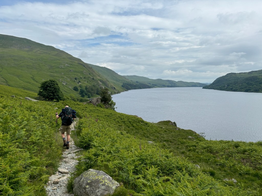 Still, we made good progress and were on top of a cold and windy Kidsty Pike before 9am. This was the highest point of our walk and the views were spectacular. But we were anxious to get down and had already had our fill of Cumbrian mountain views. The initial descent was gentle, along a soft grassy ridge. Then we found ourselves on a nasty, rocky steep descent. When you are a bit tired, your knees are no longer as supple as they were and you are carrying a 10kg rucksack, then going steep downhill is a slow form of torture. We worked our way down, bit by bit. To compound our misery, Ariane‘s left boot was giving her some ankle trouble so she had to stop and adjust it a few times. We were at least looking forward to a gentle stroll along the reservoir when we got down.