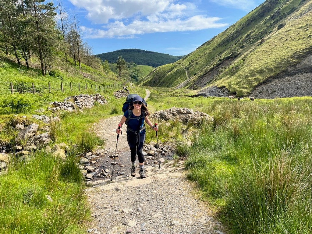 We continued over the hill on a good path and then had a steep descent through some woods. I was navigating using only a map-book and had seen that there were not many signs on the route. It was surprisingly easy to miss a turning and get off track. We also learned that going down steep hills with a rucksack on your back is hard work. Still, we soon emerged into a picturesque little valley and followed the path alongside a small river. By this time our feet were hot and tired so we took our boots off and had a paddle in the very cold Cumbrian water. After we‘d dried our feet and put our boots on we felt much better. We‘d use the „cold stream foot therapy“ quite often in the coming days.