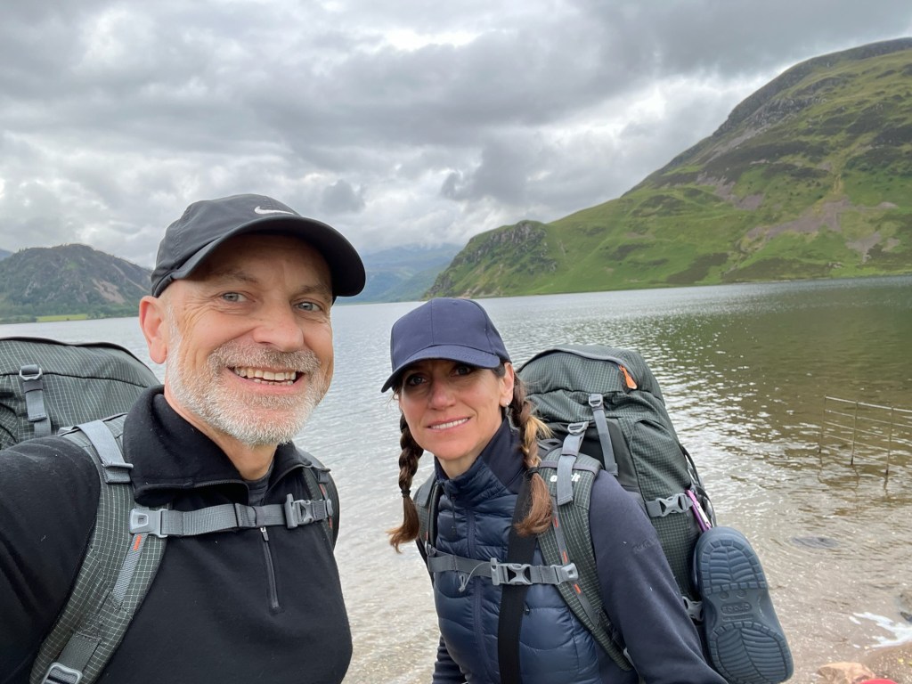 We set off on flat tracks to Ennerdale water and, as advised, took the flat route along the North edge. The sky was grey, but the views of the lakeland mountains were nevertheless spectacular. At the end of the lake, the sun came out so we stopped at a bridge for a drink and took out our tent to dry over a fence. We were soon joined by a group of about 15 walkers with a guide. We learned that they were staying in hotels and pubs and had a luggage-transfer service to transport most of their gear. We packed up and ended up setting off at roughly the same time. I was keen not to go too fast, this early in the walk, and soon the group overtook us and disappeared into the distance.