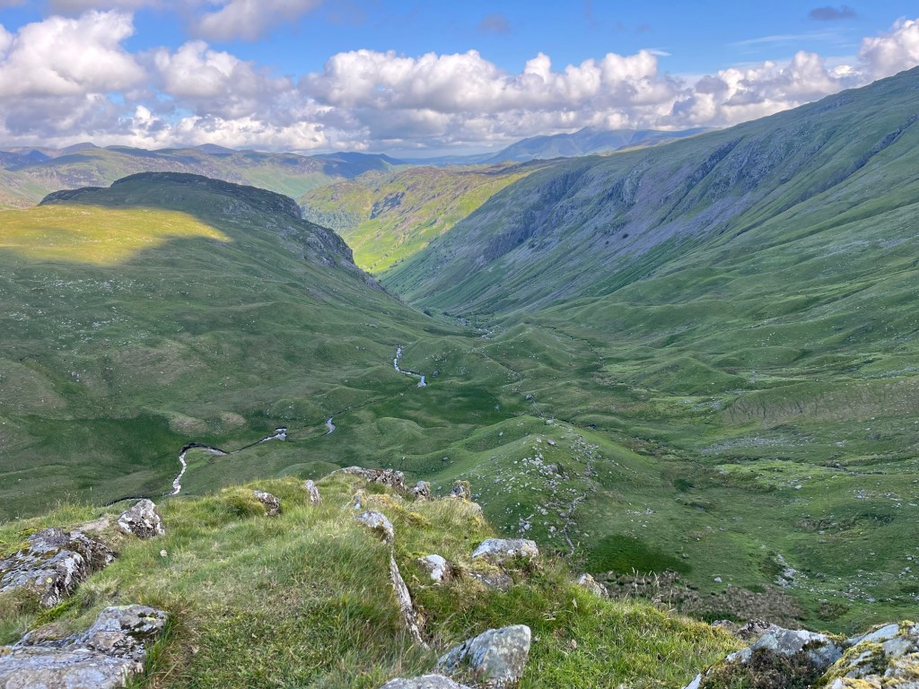 It turns out he was a very amiable Scot who had given his wife a walking weekend in the Lakes as a 30th anniversary present. He was having trouble navigating with no phone reception up there. As he had promised his wife that their walk wouldn‘t be too hilly and they were now 500m above their starting point, he was under some pressure to find the right way down. We had a look at maps and agreed on the path to take. It all worked out as we saw them again down in the valley as we bathed our feet in a cold stream.