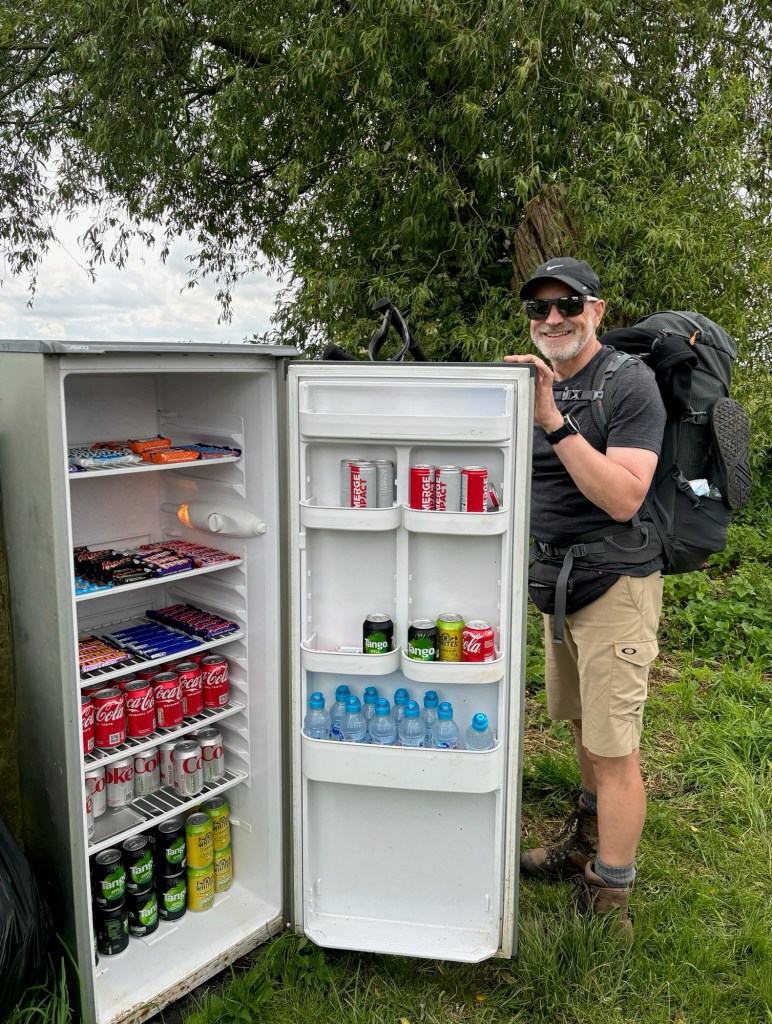 The rest of the walk was uneventful. Farmyards, tracks, gates and quite a lot of tarmac. At one farm we passed an „honesty fridge“ which was stocked with a collection of chocolate bars and fizzy drinks which took me back to the 1980s. I imagine the farmer who stocked this had grown up back then and was on a nostalgia trip. For the Brits reading this, there was R-Whites lemonade, Fry‘s Chocolate Cream, Picnic bars and even a Double Decker. I wasn‘t hungry but Ariane couldn‘t resist the Double Decker. Fuelled up on cheap biscuits, chocolate and E-numbers, she blazed the trail for the final few kilometres.