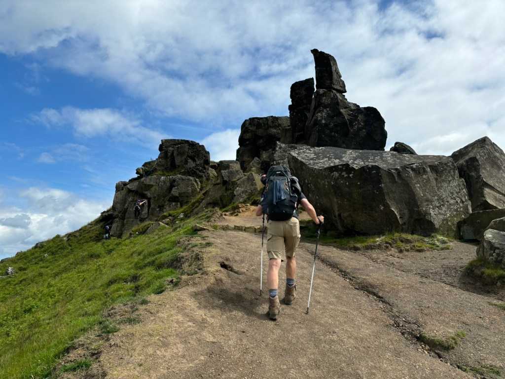 The next couple of hours were more of the same. Good paths across scenic moorland, punctuated with some rocky descents to keep us on our toes. It was fairly quiet and we only saw one or two other people until we got to a rocky area called the Wainstones. We had fair warning that things were going to change because we could hear it at least a kilometre before we arrived. A large group of schoolchildren was there on a field trip to try out climbing and abseiling. It was so incongruous – all the screaming and chaos you hear in a school playground, on an idyllic clump of rocks in the middle of nowhere. It was hard to stifle the feeling that they were in our playground and I felt a little bitter about it.