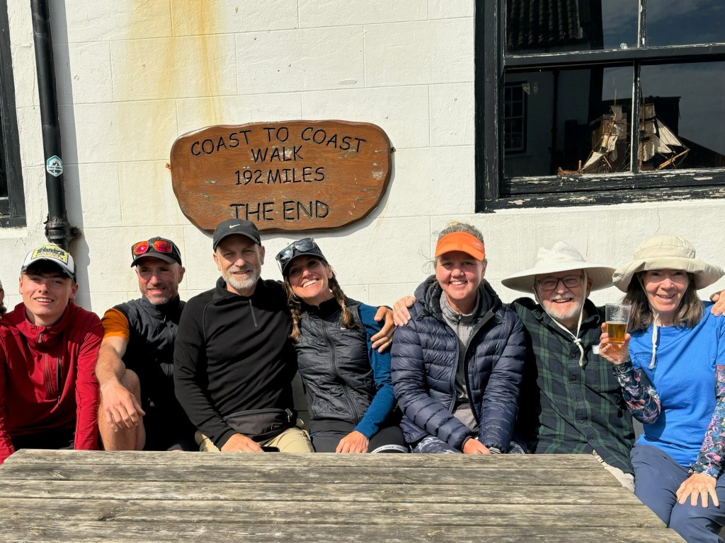 Once this was done we could get down to the business of refreshment. I can’t remember being more happy and willing to buy a round of drinks – Wainwright Gold beers of course. We colonised a table outside the pub and soon James was getting the next round in. We were all relieved, happy to be there in the sun and yet somewhat apprehensive about our life without the walk. We shared thoughts and stories. A few other people, including our American friends Jim and Ingrid, appeared and soon there was lots of chat going on. Pictures were taken to commemorate the finish. It was a perfect afternoon. Soon we were saying goodbyes. Our journey was finished but we had one more night under canvas before us.