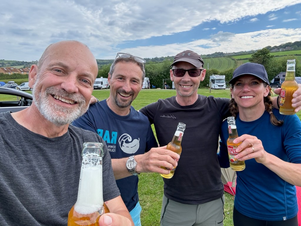 Claire was also camping at the same site as us, so we walked up the hill together. We were all a little deflated after the euphoria of finishing. Luckily for us, Rick and Graham arrived at the campsite at exactly the same time as us. Tents were quickly put up and a picnic blanket was rolled out – the boys, reliable as ever, had bought a cooler full of cold beer so we lolled around there for a while enjoying the evening sun and telling our stories. Claire joined us and later on we wandered down to the Bay for some food and a few more pints. We bumped into James, George and family but I think I may have had one too many as I can’t remember much of what we said. In retrospect I was slightly embarrassed because only that afternoon I’d been talking to James about how important healthy eating and not too much drinking was. I failed on both counts that evening.