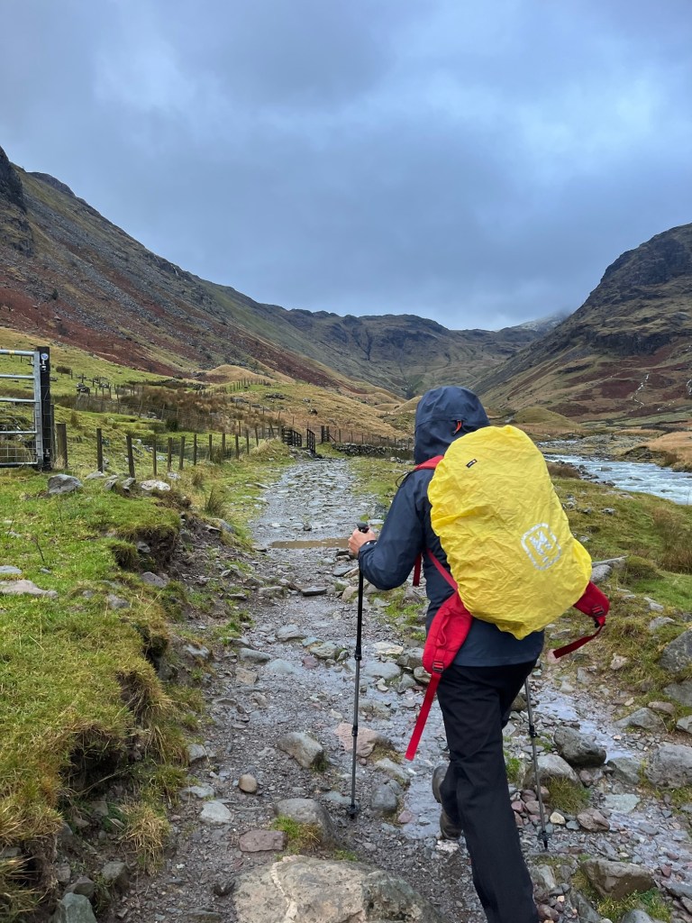 We made it to the pub (The Old Dungeon Ghyll in Langdale) after an hour or so slogging along the waterlogged valley bottom, but it was not a good spot to dry out. It was cold and fairly damp with a very small open fire which was just keeping the chill out of one corner. Other drenched walkers were gathered around the flames trying to take the chill off. A chap kept turning up with an armful of small logs but would only put them on one at a time „due to the cost“. Luckily, it was warmer in the bus and we did eventually thaw and dry out.
