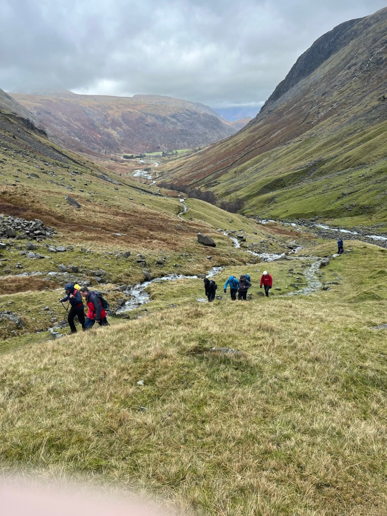 The hardy four (Rick, Graham, Magnus and Nigel) who headed back up over the pass in brutal winds just made it back to the end of the walk by nightfall. All were soaked through and it sounded thoroughly miserable. We had spent some time that morning ferrying cars around so that there would be one car parked at a pub on the route, which would mean saving a couple of miles of road-walking at the end of the day. As darkness came in and the four were battling into the gale, I am sure the thought of a cosy inn was keeping them going. Unfortunately (more great planning) the inn was closed! But to everyone’s great relief, Dr. John was waiting in a warm car with the engine running and the heating on. Cars were collected and we all converged on Keswick.