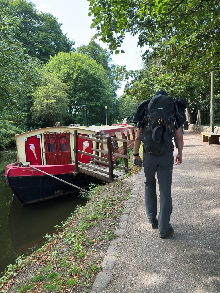 We had a pleasant lunch in one of the Salt‘s Mill restaurant and then said goodbye to Dad, our taxi driver, donned our rucksacks and strolled out of Saltaire in warm sunshine, delighted to be on our way.