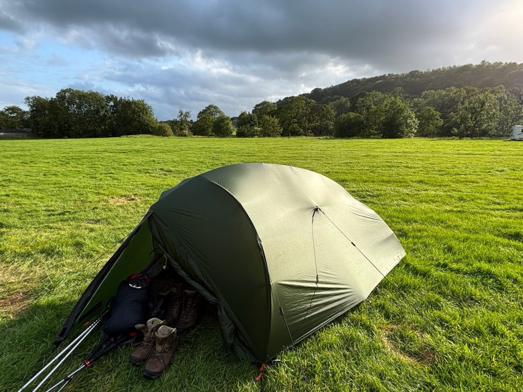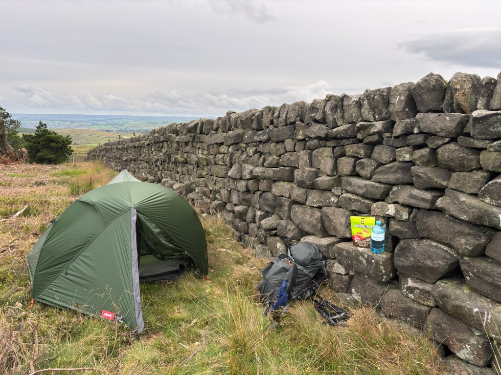 Soon Baildon was behind us and we were heading across the open moorland towards Ilkley. We made good progress and I was enjoying the strong wind. I miss the wind, living in Germany. We don‘t get very many windy days. As the week went on, my love for the wind declined – but I‘ll get to that later. After a quick drink stop to admire Ilkley and the Wharfe valley stretching into the distance, we started to look for a place to „wild camp“. We knew a storm was coming on the next day. The sun had disappeared behind high cloud and the wind had picked up. We eventually found a spot behind a sturdy wall next to a tree plantation above Addingham. The tent was set up, dinner cooked on our little gas stove and we got to bed before the rain started.