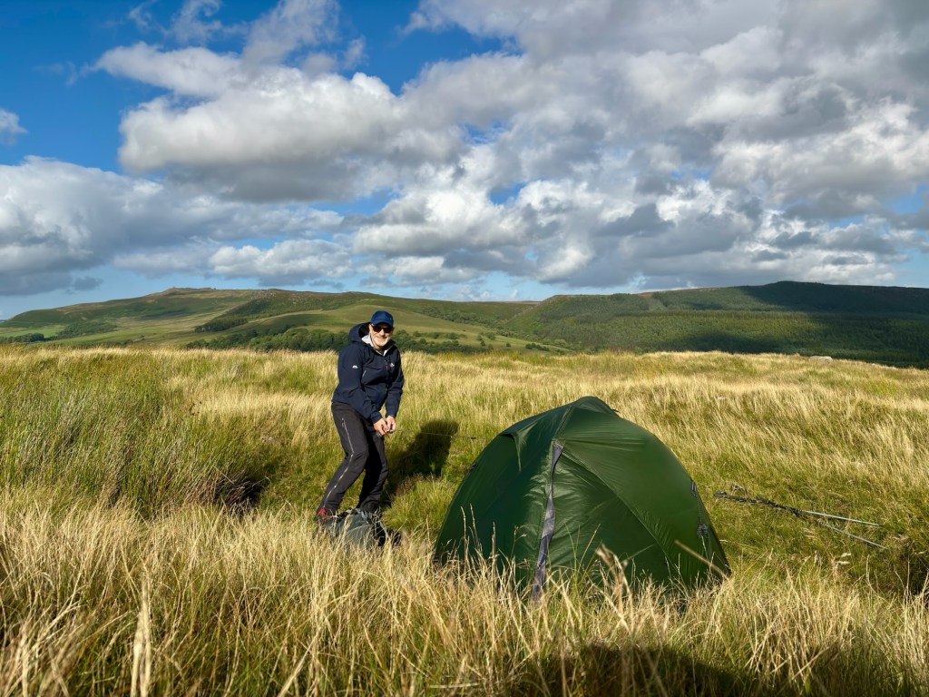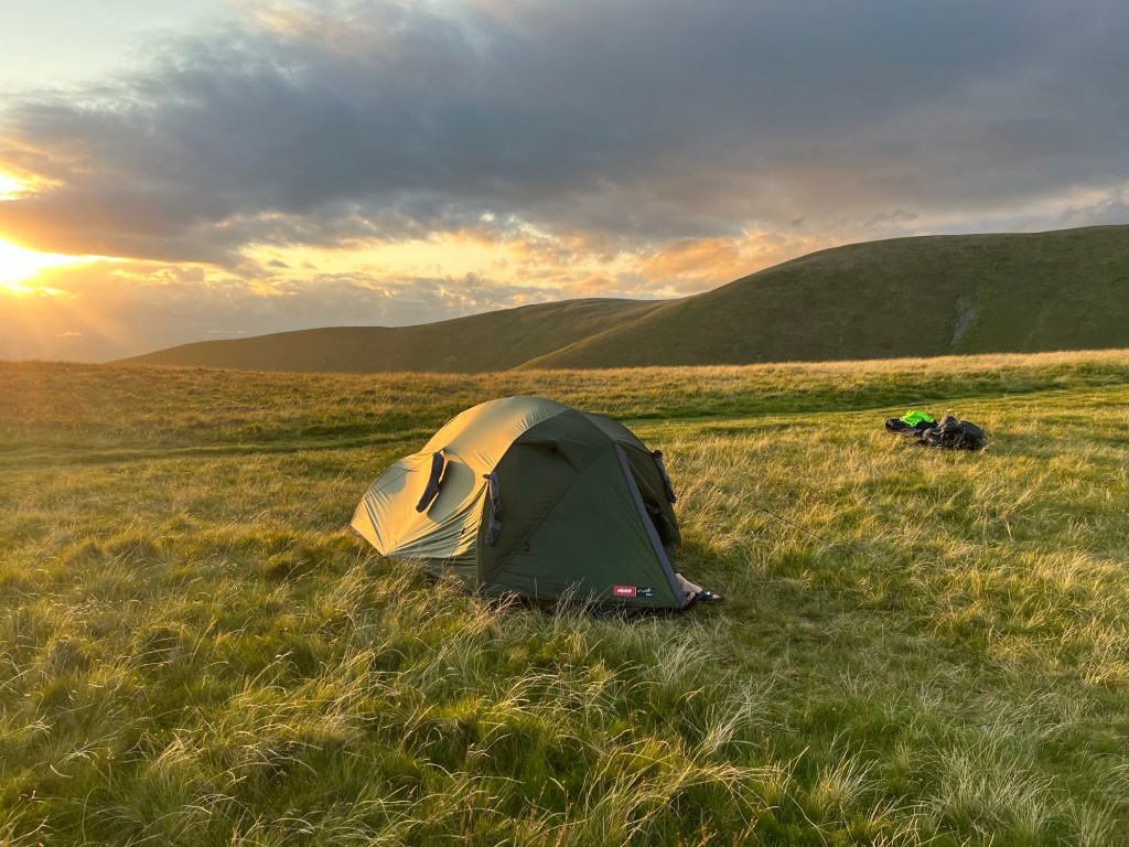 We pitched the tent, which was still wet from the previous night but dried out quickly in the wind. Normally, we would look for a private and secluded spot to pitch the tent, but it was very open and exposed so there was nowhere to hide. Somewhat reluctantly, and because I was so tired, I decided we should pitch the tent where we stood – right next to the main footpath over the Howgills. I assured Ariane that nobody else would be up here so late in the day.