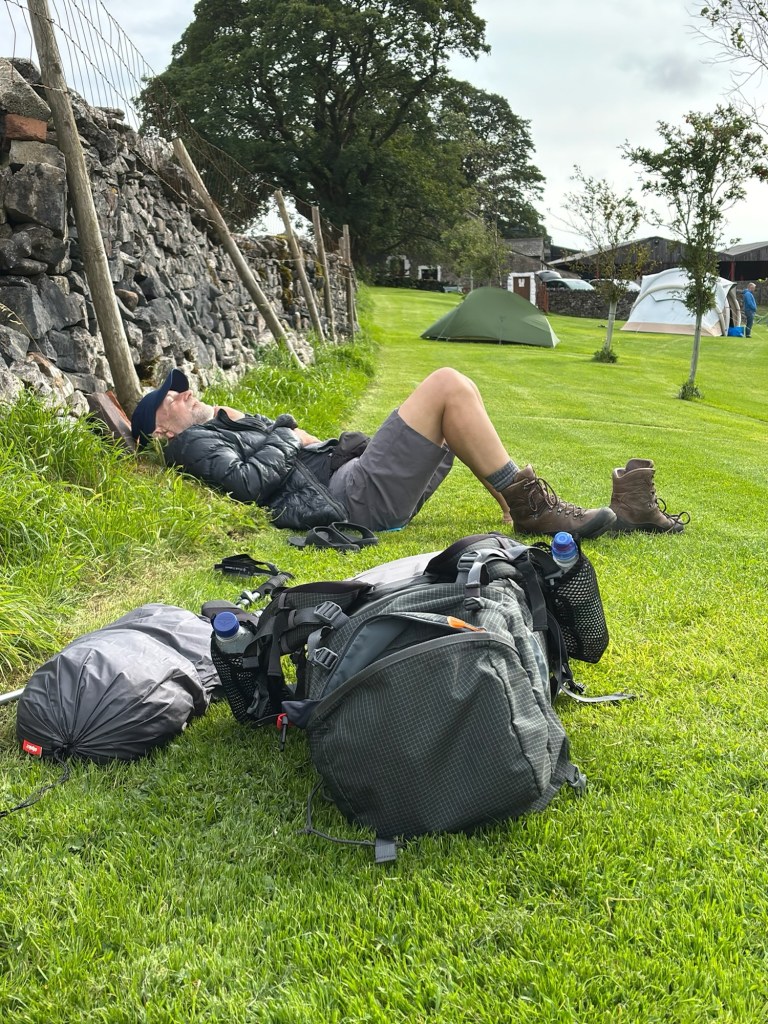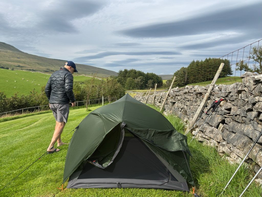Our spirits lifted again. We had treated ourselves to a night on a proper campsite and we knew we would be eating well later. Luxury. I set the tent up on a very flat and very soft bit of grass. There would be no caterpillar moves required that night. We both had showers and soon Dean collected us and drove us into town. We had a great pub meal and a good catch-up with Dean. As we were nicely settled in, 2 other friends, Andy and Graham popped their heads around the door. They knew about our walk and reckoned we should be in Settle but didn‘t really expect to see us in the first pub they tried. They had been out climbing and we all enjoyed a beer together – fuelled by the good feeling you get from being warm and full but feeling like you earned it after a day on the hills.