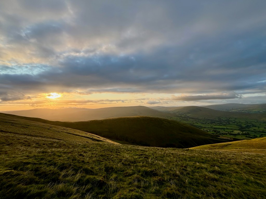 I would love to have enjoyed another cold beer and then settled into a cosy Bed and Breakfast, but after dinner we had to head out up onto the hills and find a place to pitch our tent for the night. So we bid our new friends farewell and were soon trecking up a very pretty, but very steep path into the evening sun. At least it was dry and not too cold. I was really tired and struggled to keep up with Ariane. After about an hour’s walk uphill, we eventually came up to a plateau with a fantastic view all the way to the Lake District and the Irish Sea to the west.