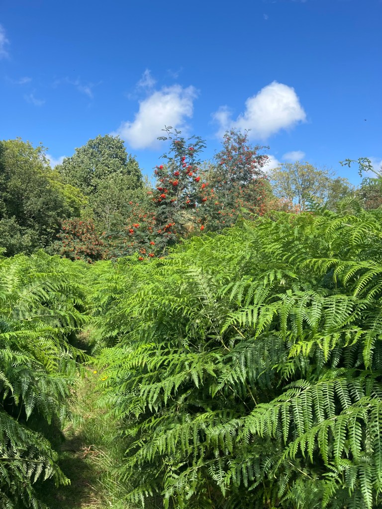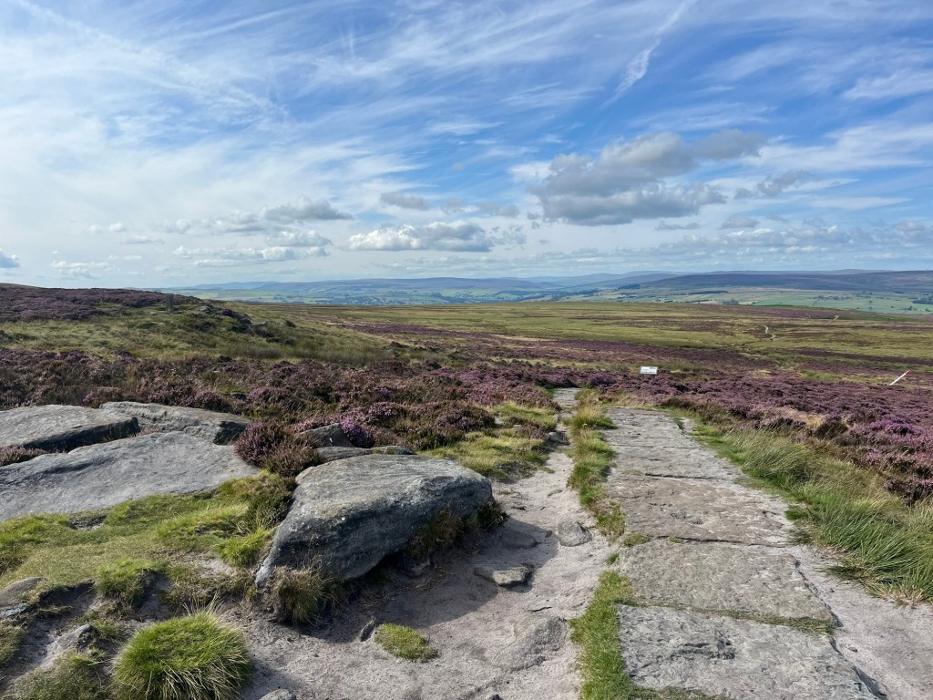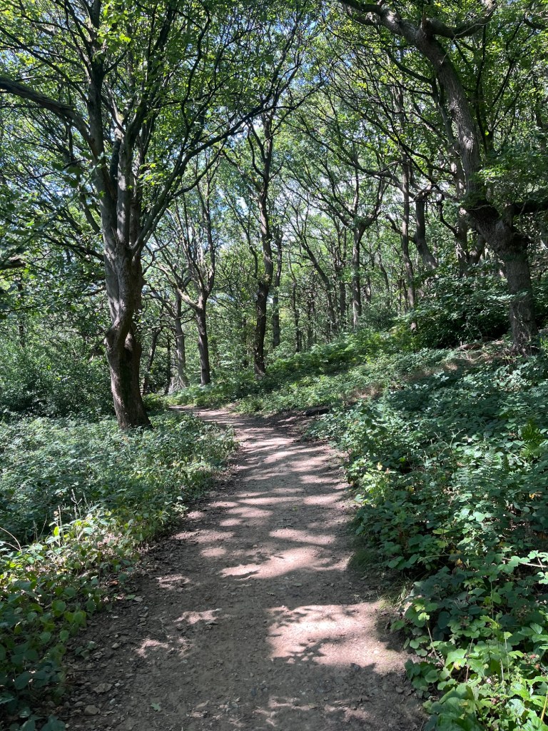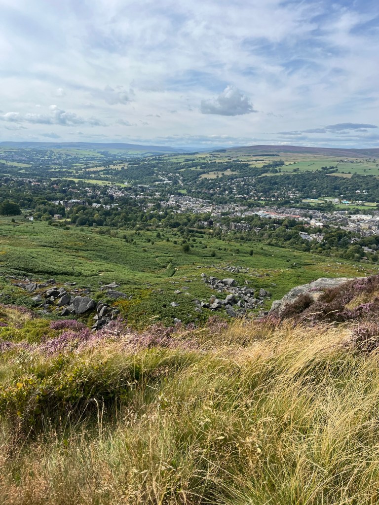 After less than a mile we were in a dense wood, heading uphill through Shipley Glen. As we climbed, the valley narrowed and the wide path turned into a single sheep-track with high bracken on either side. We weaved our way up to the top of the Glen and emerged at the base of Baildon moor. I had spent many happy hours here with my brother 50 years ago. My Dad was a hang gliding pioneer and as he and his friends made the first short flights, my brother Rob and I would tire ourselves out running around and hiding in the bracken. It was a pleasure to be walking along the very road which had played a significant role in those early flying days. If a pilot made it „over the road“, that was considered a long flight. I pointed out various features to Ariane, who was happy to let me enjoy the nostalgia. „This is where my Dad‘s mate landed on a parked van. Up there are old mining craters that Rob and I used to call bomb-holes and play in. Here is where the hang-gliders were de-rigged. We were allowed to carry Dad‘s harness and helmet back to the car. We felt cooler than the spectators.“